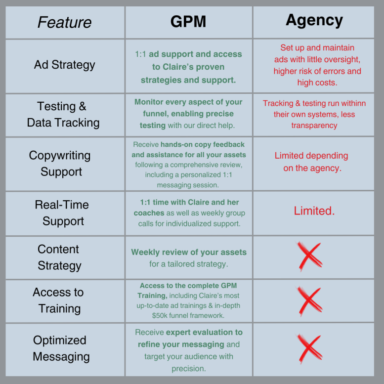 Nope! This is a holistic look at your overall marketing plan for your business, which may or may not include running Facebook Ads. If you want them, you can have access to any of my courses and add the GPM team to your ad account for extra eyes in the Ads Manager. The program will not be focusing on Facebook Ads as the only topic.